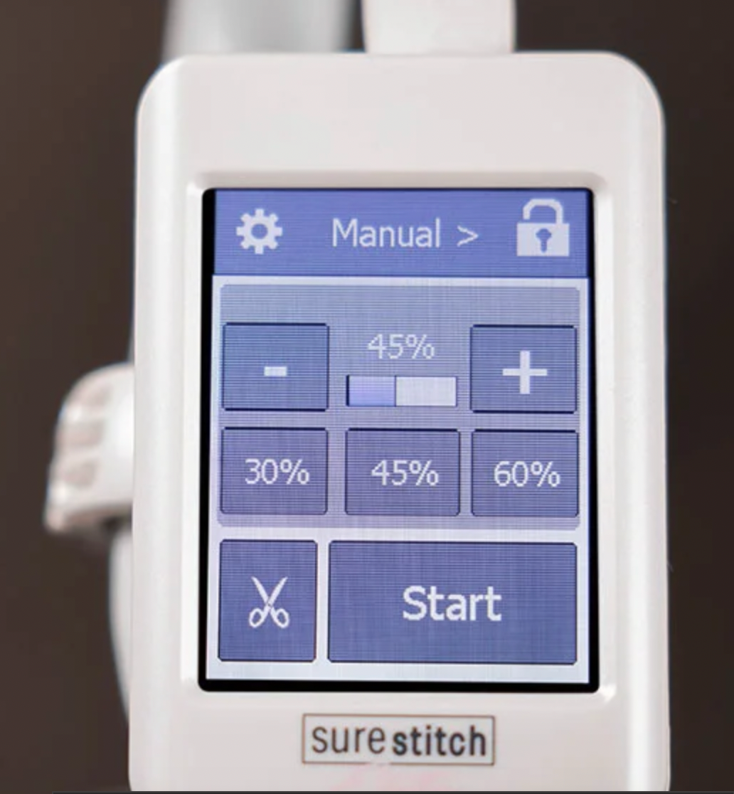 The Sure Stitch regulates stitch length and speed control. As you speed up and slow down, so will your machine, keeping all of your stitches the same length. When used as speed control, the SureStitch lets you adjust the speed of your sewing machine with the push of a simple button.