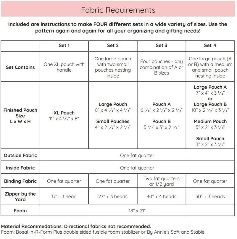Pack a spare outfit in Set 1's extra large pouch, or organize all your small items with nesting Sets 2 and 4. Making gifts? Choose Set 3 and sew up four pouches at a time! Or just make them all and mix and match your favorites sizes!