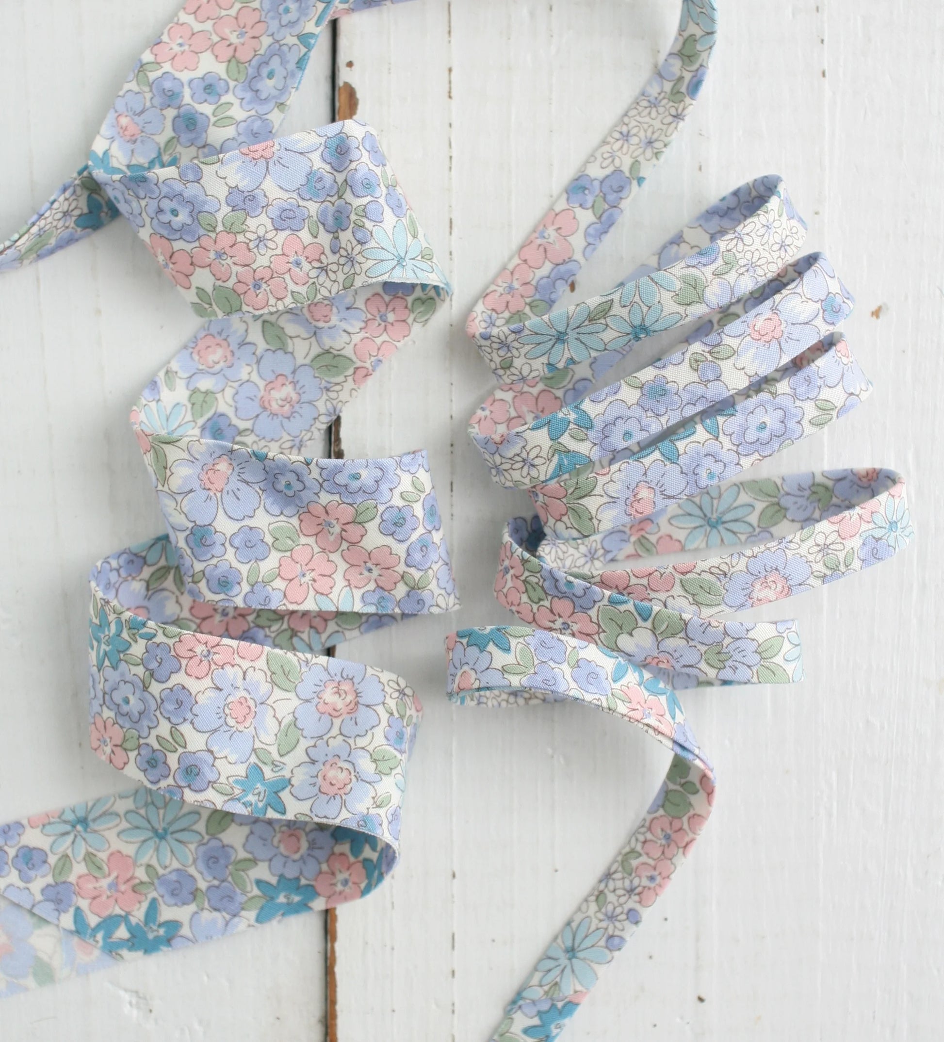 Sizing: bias tape has a finished width of 1/2". Bias quilt binding is cut at 2.5" with a finished width of 1.25".