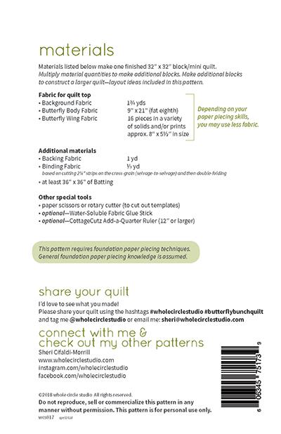 Butterfly Bunch is a fun graphic wallhanging / mini quilt that uses foundation paper piecing techniques. Make additional blocks to make a larger quilt (layout ideas are provided to make a lap, twin or queen quilt). This tested pattern contains both detailed instructions and diagrams, making it easy to piece. Each butterfly block measures 14″ x 14″ making it a flexible design to customize your own quilting project.