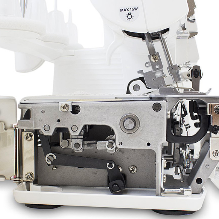 Lay in Tension System Universal throat plate allows you to go from standard serge to roll hem with the flip of a switch.