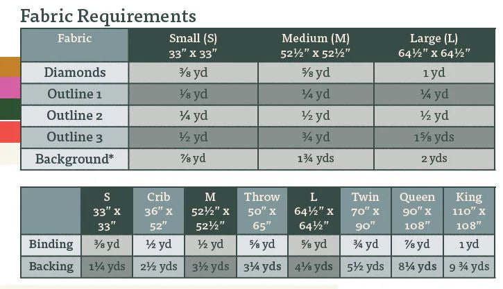 There are 3 star sizes in this pattern: Small (33" x 33", Medium (52.5" x 52.5"), and Large (64.5" x 64.5"). These sizes can be made as is or they can each be made into larger quilt sizes with additional background fabric. There are 8 total quilt sizes in the pattern.