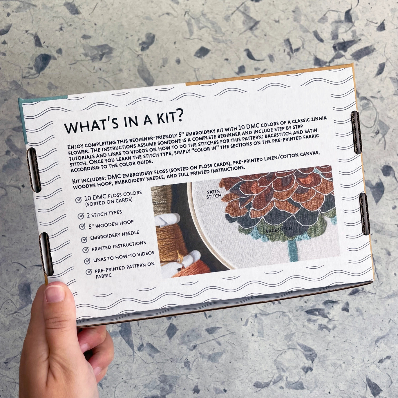 Enjoy completing this beginner-friendly 5” embroidery kit with 10 DMC colors of a classic zinnia flower. The instructions assume someone is a complete beginner and include step by step tutorials and links to videos on how to do the stitches for this pattern: backstitch and satin stitch. Once you learn the stitch type, simply “color in” the sections on the pre-printed fabric according to the color guide.
