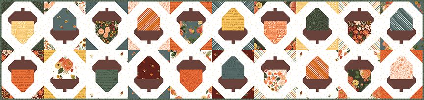 The Acorn Love Runner Kit includes pattern and fabric for runner top and binding. Backing not included. Fabric featured is Happy Fall Days by Kelsey Carlson. Pattern is by Lori Holt of Bee in my Bonnet.
