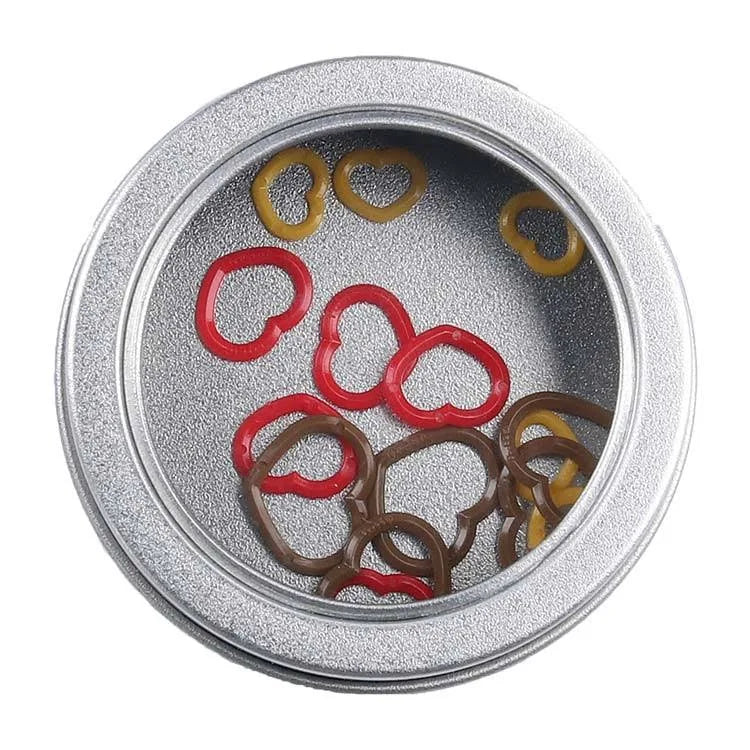 The heart-shaped marker rings come in packs of 15; you receive 5 markers in each given size. And when not in use, store them neatly in the aluminum tin provided.