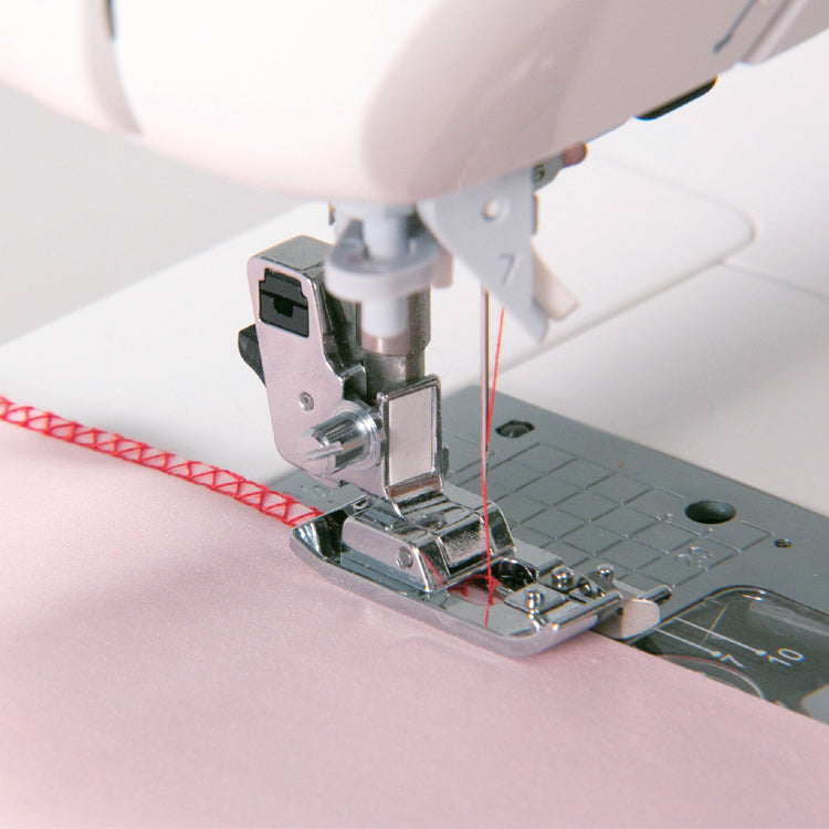 Sew with the edges of the fabric aligned with the guide. The prong in the opening of the presser foot presses down the edge of the fabric to prevent puckering. In addition, the amount of thread going into the stitching is adjusted by the thread crossing the prong, creating clean finish with little shrinkage.