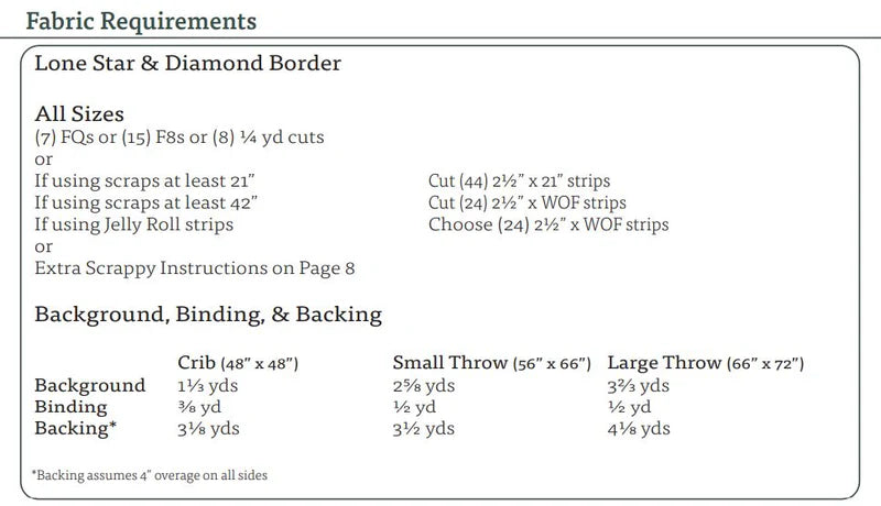 This design is a variation on the classic Lone Star Quilt. The purpose of this pattern is to make a patchwork Lone Star by using what you already have on hand. It is perfect for using remaining fabric from Fat Quarters, Fat Eighths or yardage from previous projects. This patchwork Lone Star can also be made with a portion of a Jelly Roll or super scrappy using smaller scraps from your fabric stash. I recommend at least 8 different fabrics to achieve the patchwork look.
