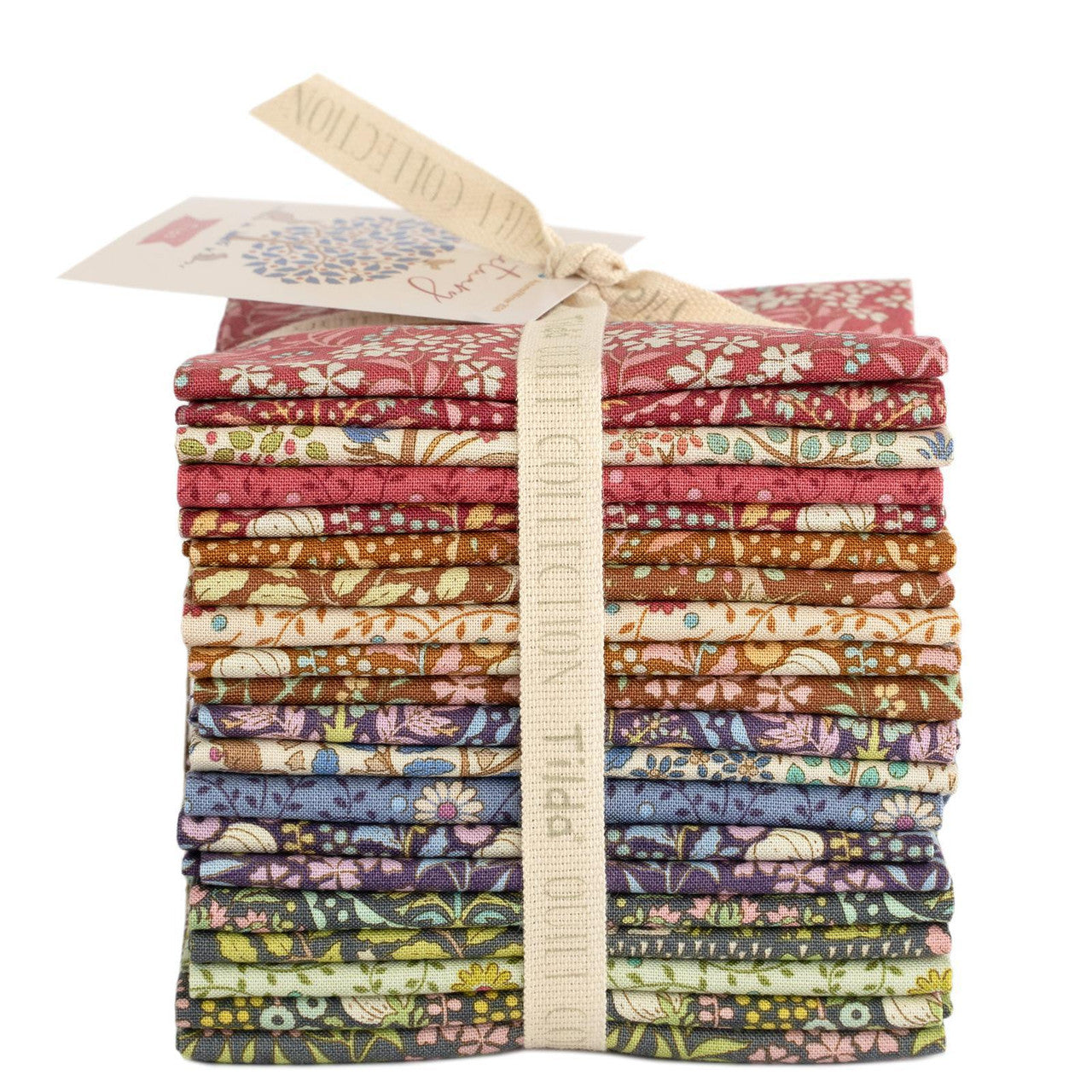 Tilda's Sanctuary Collection Fat Eight Bundle includes 20 20in x 11in fabric pieces of the main collection prints. This soft, muted autumn winter collection is all about feeling safe, cozy and grounded in your sanctuary. The tones of caramel, rhubarb, eggplant and greygreen, with ornamental patterns combined with woodland scenes and florals, create a peaceful homey look perfect to create your ideal sanctuary.