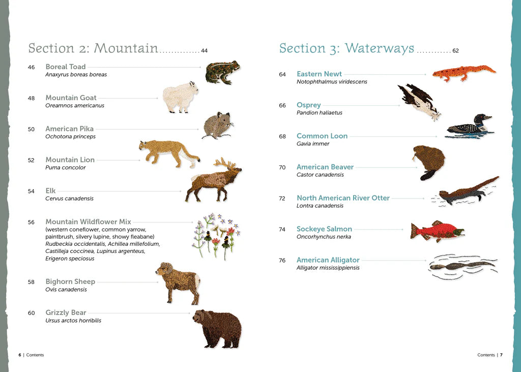 Connect to the wildlife of seven North American ecosystems by stitching these 52 beautifully accurate designs, from bears to manatees to prairie dogs and more.