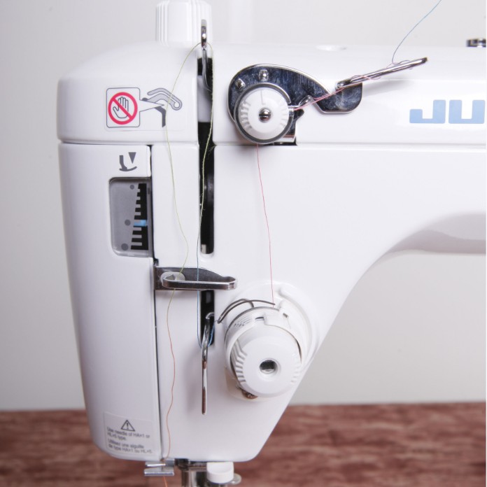 - Automatic Thread Trimmer: The machine is equipped with an automatic thread button that simultaneously trims the needle and bobbin threads at the sewing end by lightly pressing the push-button. Both the trim button and the foot controller engage the advanced Juki industrial style thread trimming mechanism.